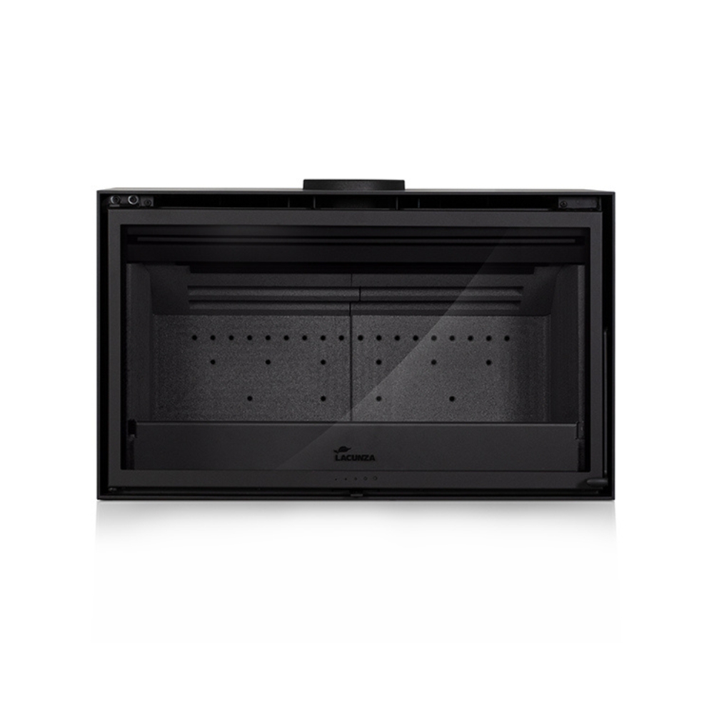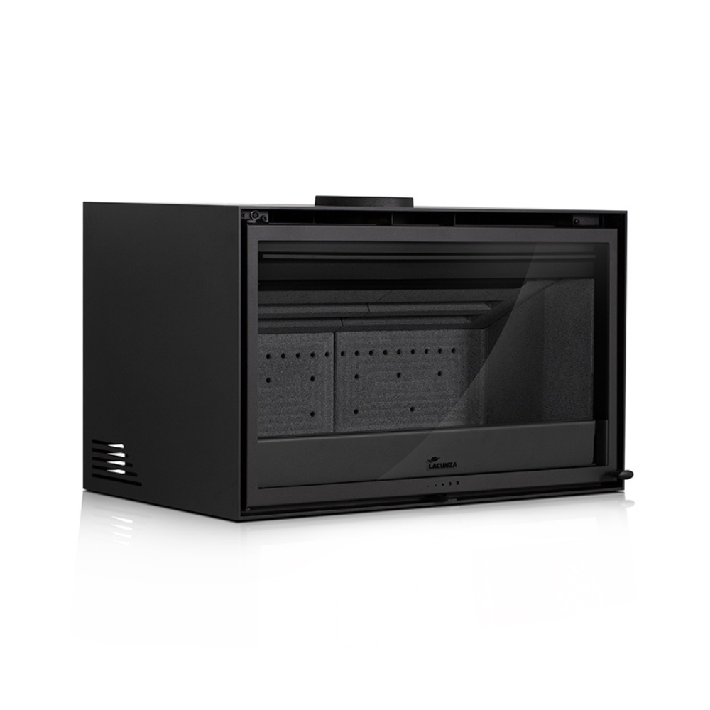 The Lacunza Nive 800 freestanding fireplace boasts outstanding performance features. A single control manages both the combustion system and the glass air wash, ensuring optimal operation and burning. Additionally, the double combustion system extends burn time and reduces consumption by efficiently burning gas obtained during the primary combustion cycle. Also available in a larger 1000 size, this fire can be installed with the optional wood box or on a base of your making, with external air intake capability. Fans are optional.