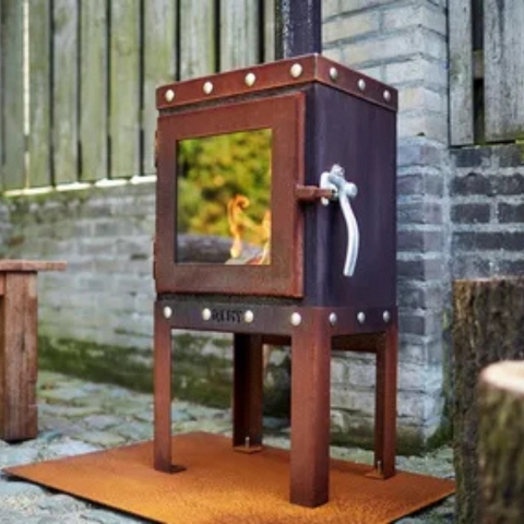 Hand made in Holland, the RB73 Piquia model is a compact CorTen steel wood stove with an industrial look. This outdoor wood fire has a galvanised steel door handle and stainless steel lock bolts around, both above and below the door, contrasting with the warm rustic plate material.